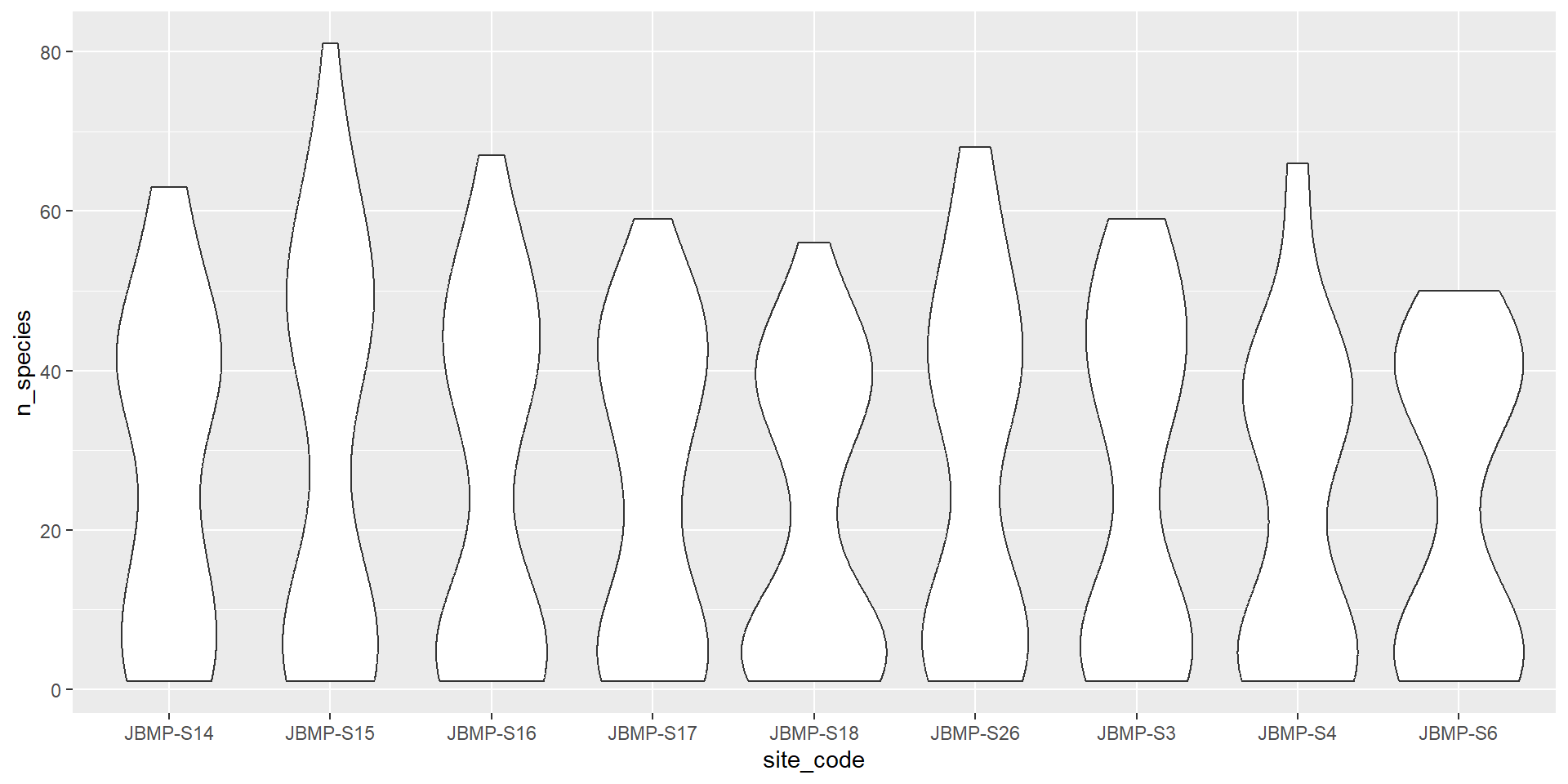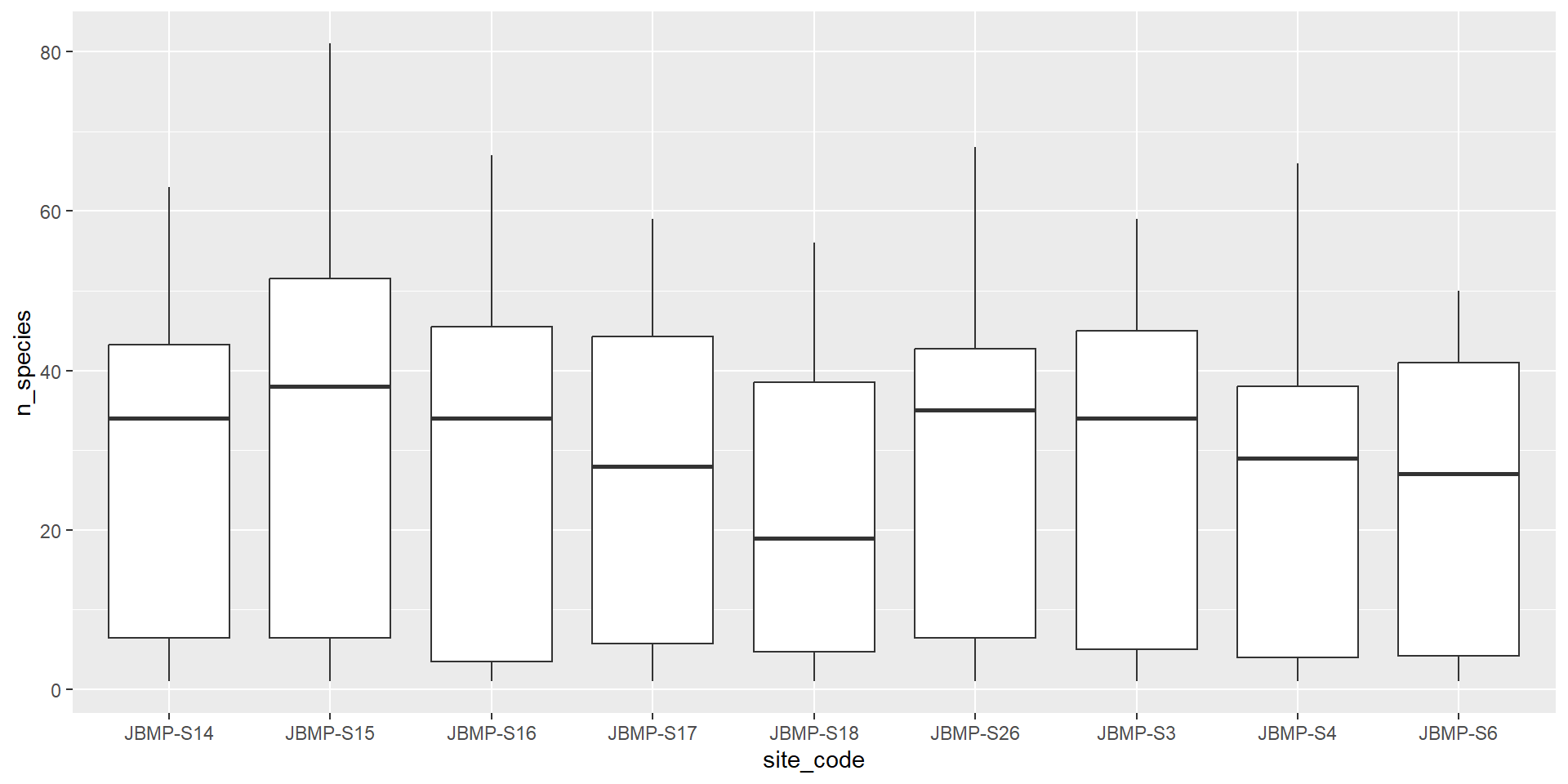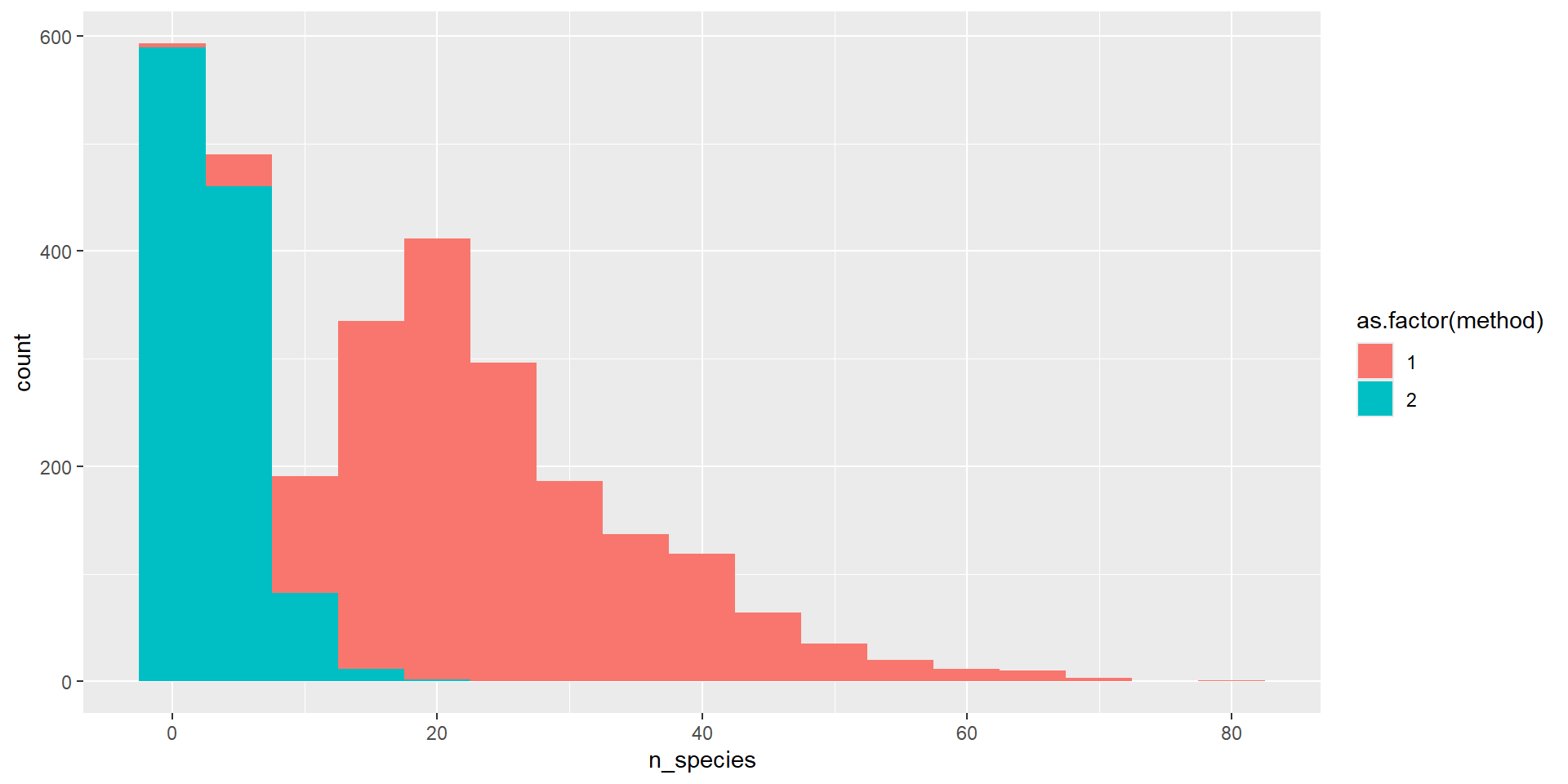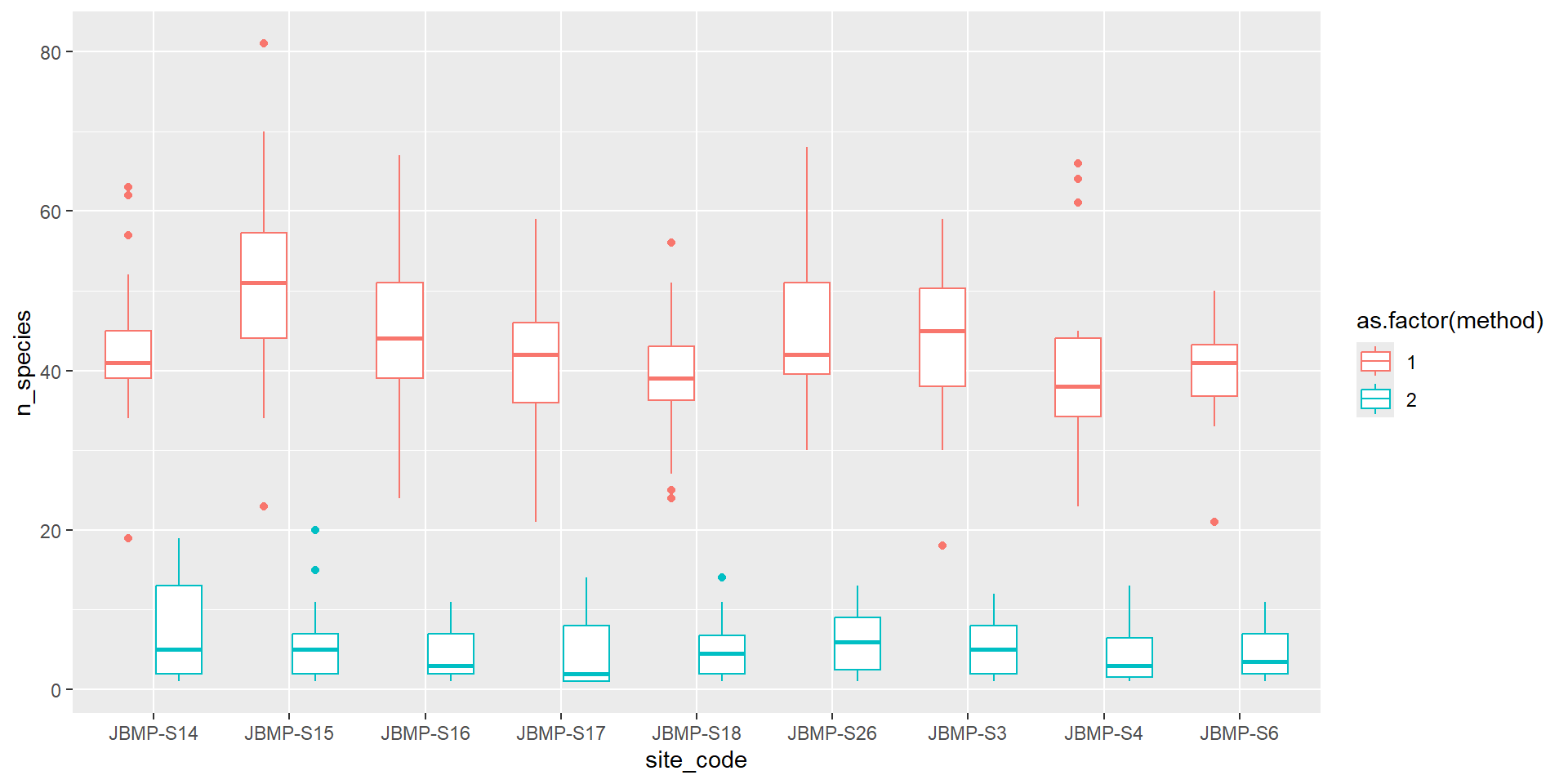 labs(fill = "Method", x = "Site Code", y = "Mean number of species")# Making pretty plots