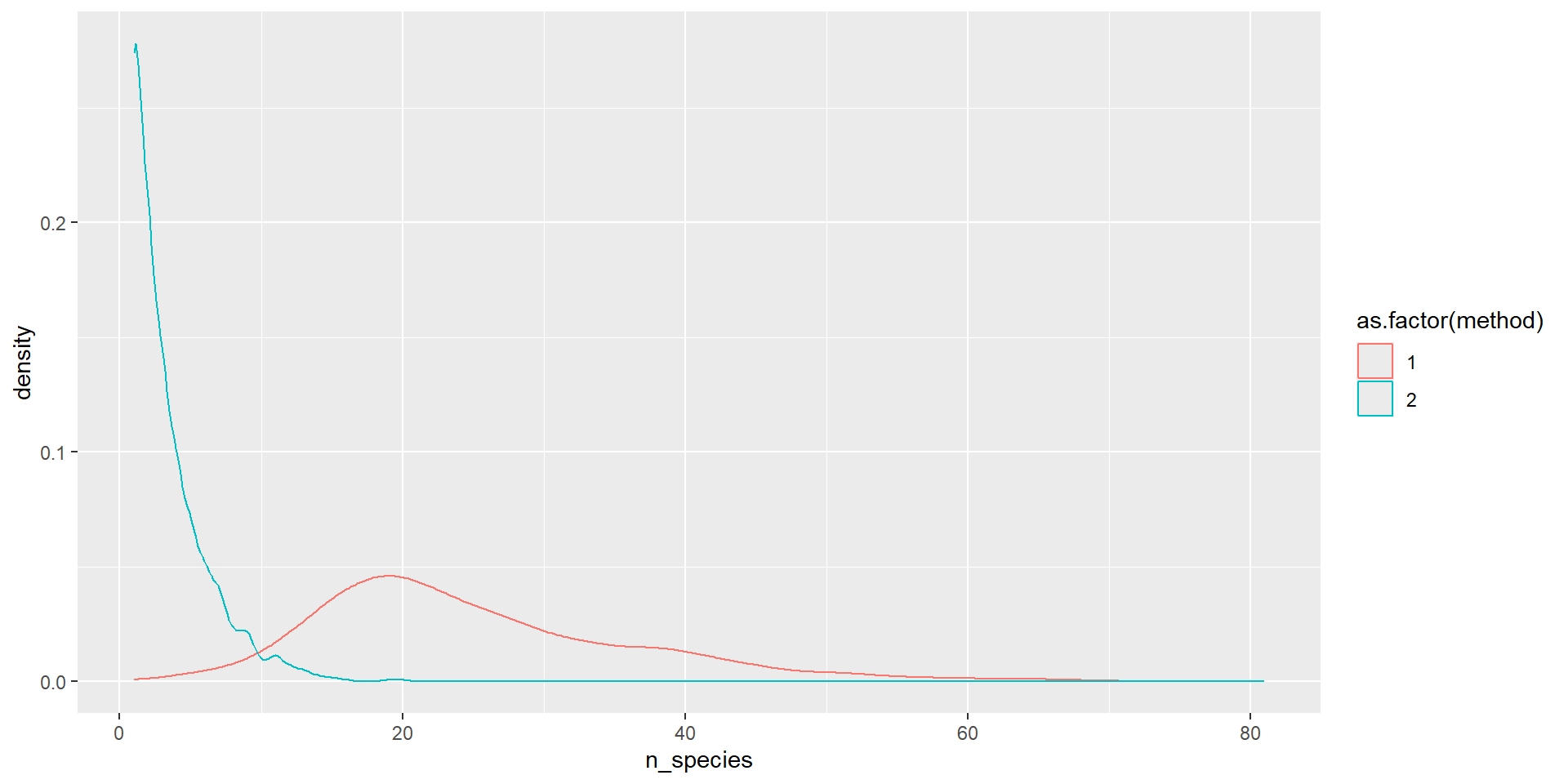 summarise(mean_diversity = mean(n_species, na.rm = TRUE), .by = c(year, method)) %>%